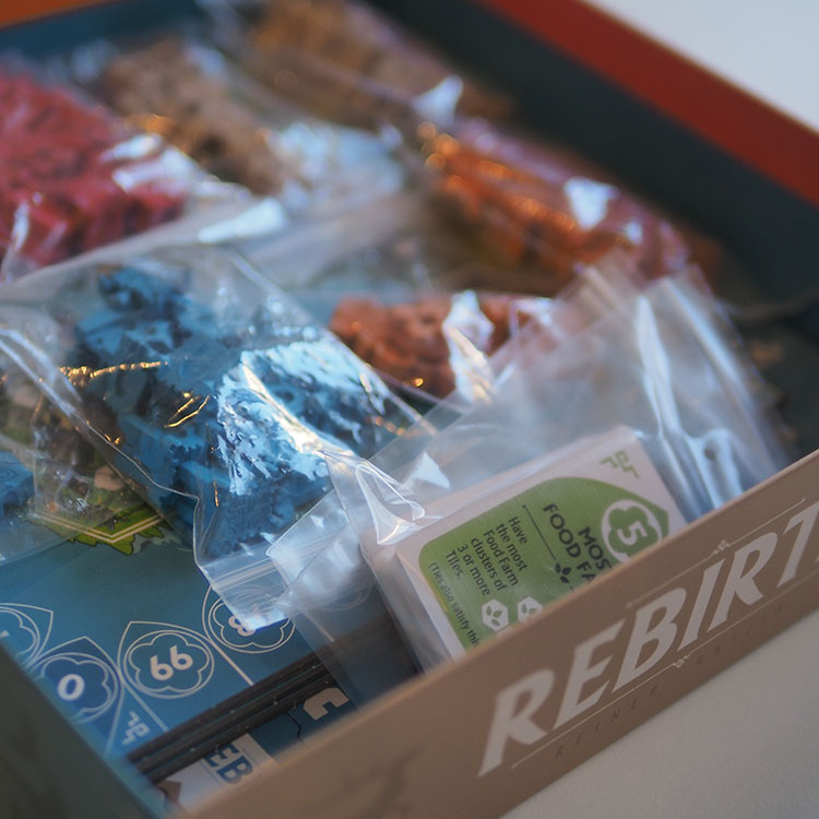 Rebirth is a new, tile-laying game from Reiner Knizia. The game revitalizes this classic genre by combining Knizia’s elegant mechanics with Mighty Boards’ evocative world building. The result is a eurogame with smooth gameplay, set in a lush and hopeful future.