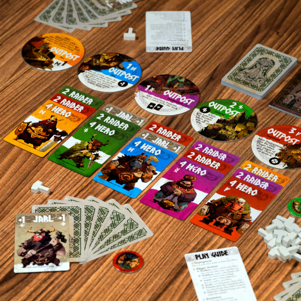 Players will deploy Raiding Parties to try gain control of various Outposts. By deploying more Raiders. Jarls and Heroes, a player reveals which Outposts they are battling for, giving away their strategic position. Resources are scarce - so players must balance their deployed warriors with the need to reserve a Party large enough to compete in the final "Ragnarok" round - where even the Norse Gods become involved.